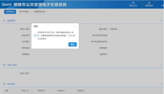 4、初次登录系统需要完善信息,点击修改信息,然后按要求填写信息后提交审核(提交后系统自动审核通过)